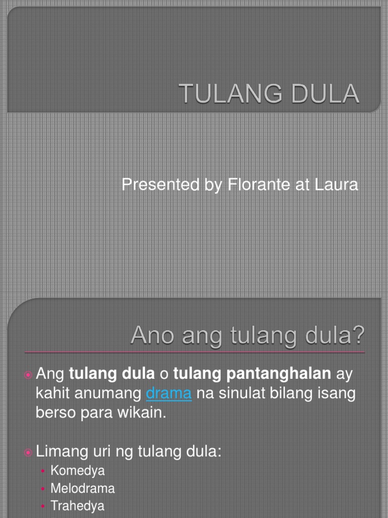 Ating tandaan na sa kasaysayan ng dulang Pilipino isinilang sa lipunan ng mga katutubong Pilipino bago pa man dumating ang mga kolonyalista. Ang mga uri ng dula sa panahon ng Kastila ay ang a Dulang Pantanghalan bDulang Panlansangan at c Dulang Pantahanan. Uri ng Tula Ano Ang Mga Ibat Ibang Uri ng Tula At Halimbawa Lahat ng Taoy may Karapatan Buod at Aral Tula sa Karapatang Pantao Tula Kahulugan Ano Ang Kahulugan Ng Tula ElementoAt Halimbawa.