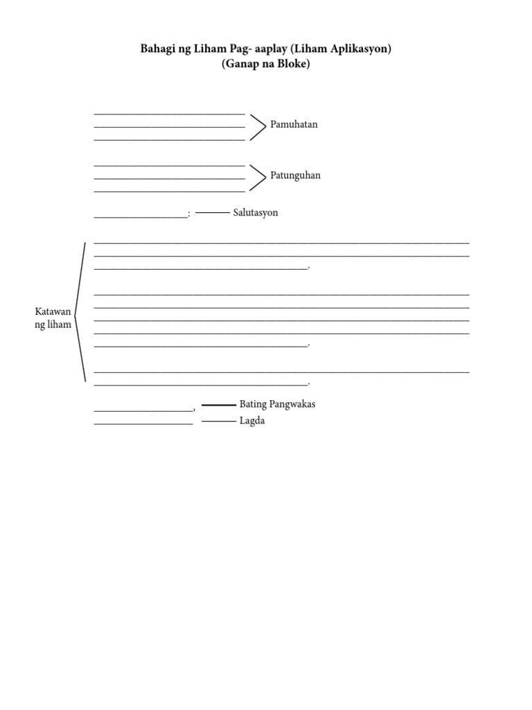 Ito ay maikling pagbati sa sinusulatan na ang bantas na ginagamit sa hulihan ay kuwit. LIHAM APLIKASYON Sa paksang ito tatalakayin natin kung ano ang uri ng liham na ito ang mga halimbawa. Kailangang may tamang pagkakasunod-sunod ng mga salita pangungusap talata at mga bahagi ng liham.
