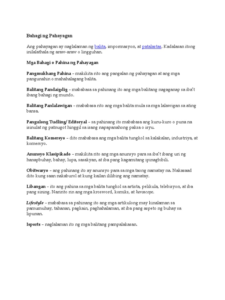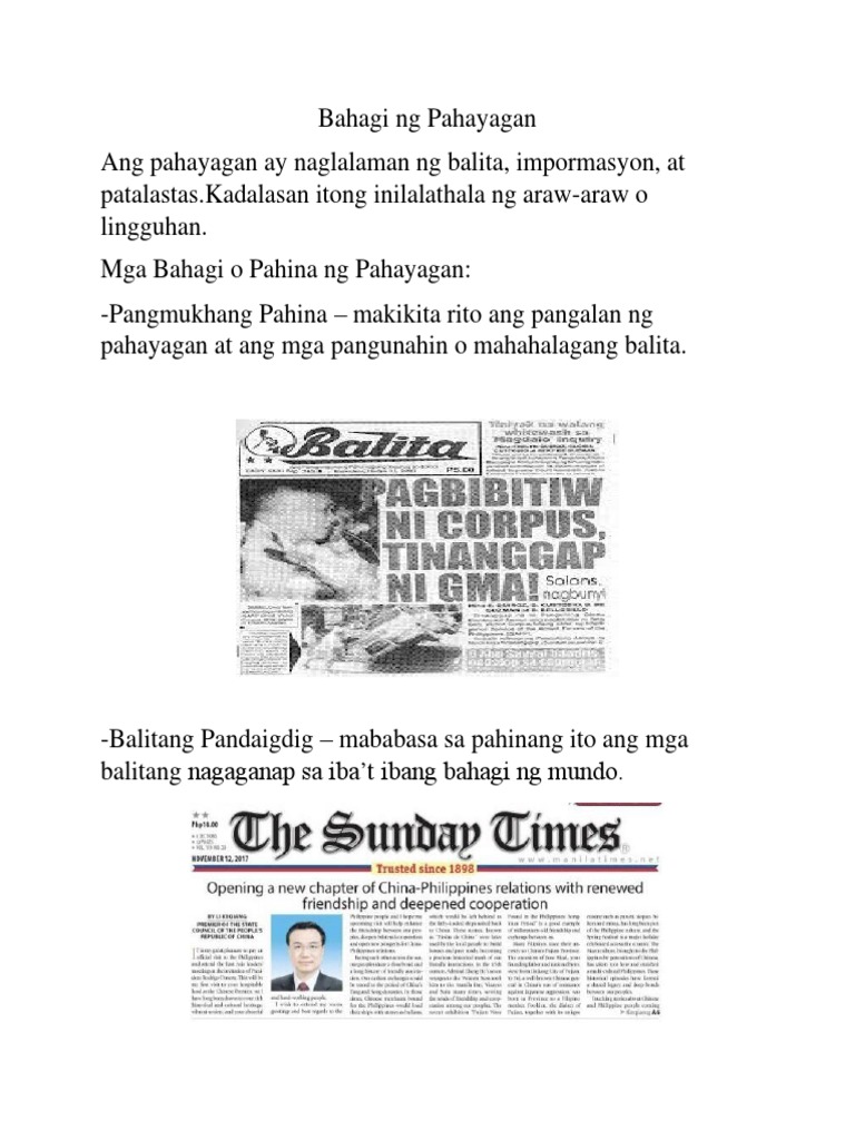 Mababasa rito ang mga balita mula sa mga lalawigan sa ating bansa. Halimbawa ng teknikal na. Mga Bahagi ng Pahayagan para sa Ikalimang Baitang at Ika-anim na Baitang Pangmukhang Pahina Balitang Pandaigdig Balitang Panlalawigan Editoryal o Pangulong Tudling Pitak o Kolum Balitang Komersyo Pahinang Pang-Classified-Ads Patalastas sa Pagkamatay o Obitwaryo Lathalain Feauture Story Pahinang Panlibangan Pahinang Pampalakasan Sana.