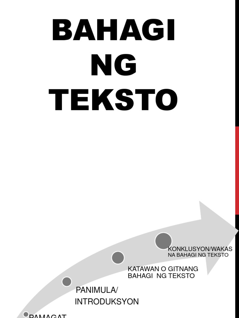 Mga Bahagi ng Teksto Ang isang teksto o sulatin ay binubuo ng tatlong pangunahing bahagi. MGA URI NG TEKSTO-Isang Kolaboratibong Presentasyon Ng Mga Mag-Aaral Ng GAS-Block 2. Ang teksto upang mapatunayan kung ang hinuha o hula niya tungkol sa teksto ay tama kulang o dapat baguhin.