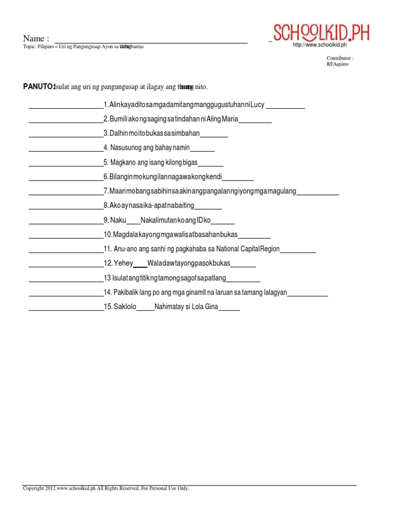 Uri ng pangungusap Other contents. Uri ng Pangungusap_3. Pangungusap Worksheets Part 5 The five pdf worksheets below are about the five types of Filipino sentences.
